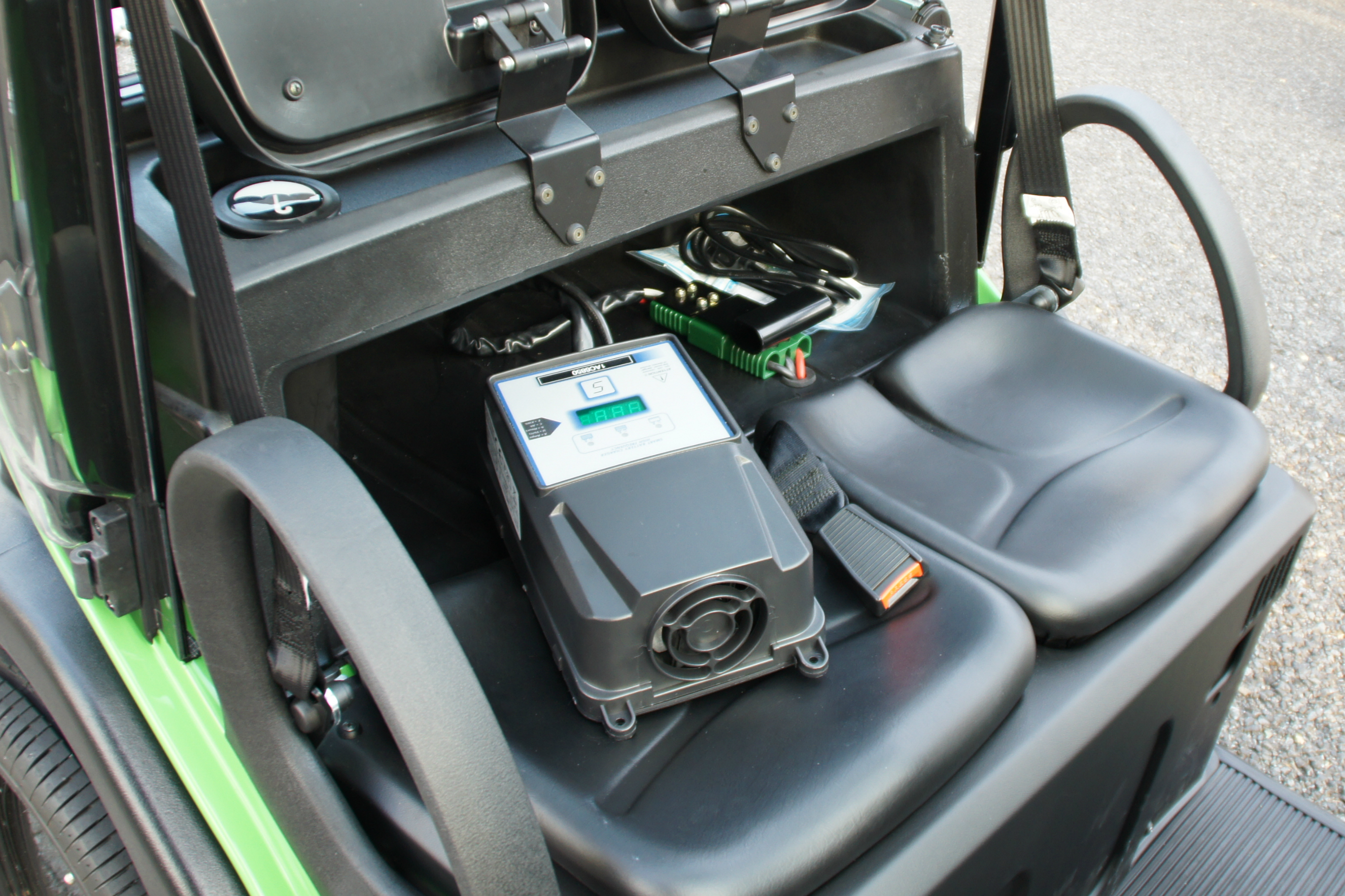 奥に見える緑の部品がバッテリーと車体をつなぐコネクター、