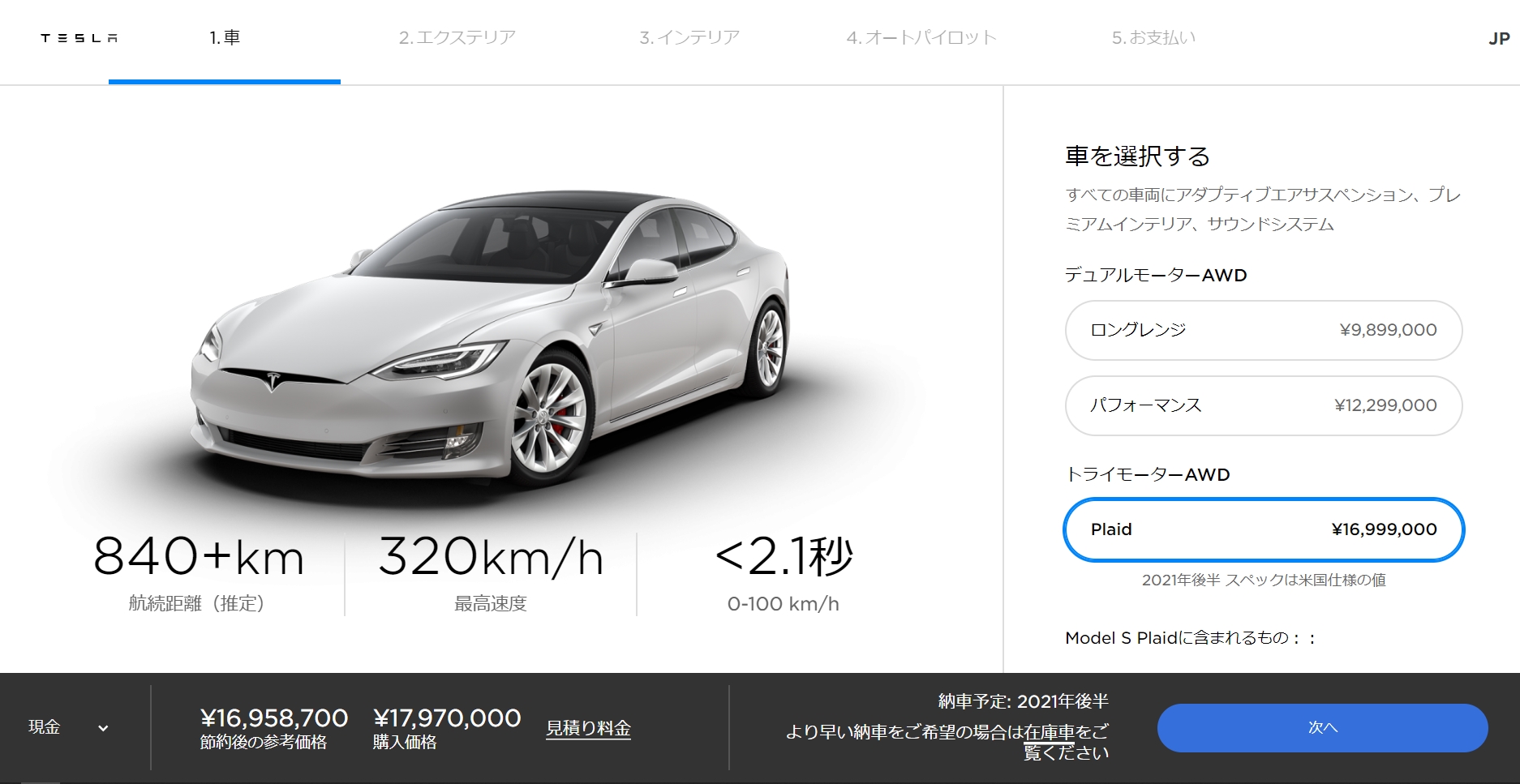 2020.09.23、モデルSプレイドを発表、2021年後半からの納車予定。