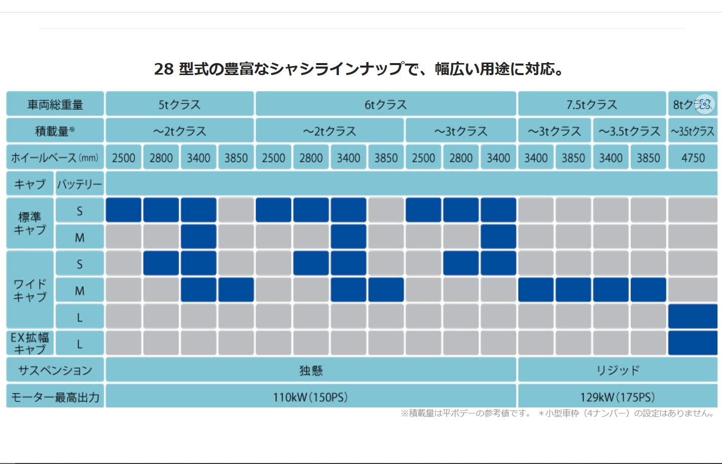 | ホイールベース(㎜) | 走行可能距離(㎞) | バッテリー搭載量(kwh) | |